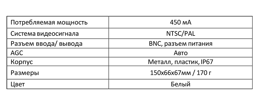 Камера выполнена в корпусе из металла и пластика со степенью защиты IP67, что делает её устойчивой к внешним воздействиям. Рабочий температурный диапазон от -45°C до +50°C. Питание устройства – DC12V±10%