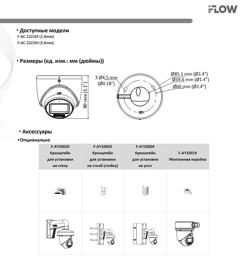Видеокамера F-AC-2322M является 2 Мп купольной камерой с фиксированным объективом и двумя подсветками