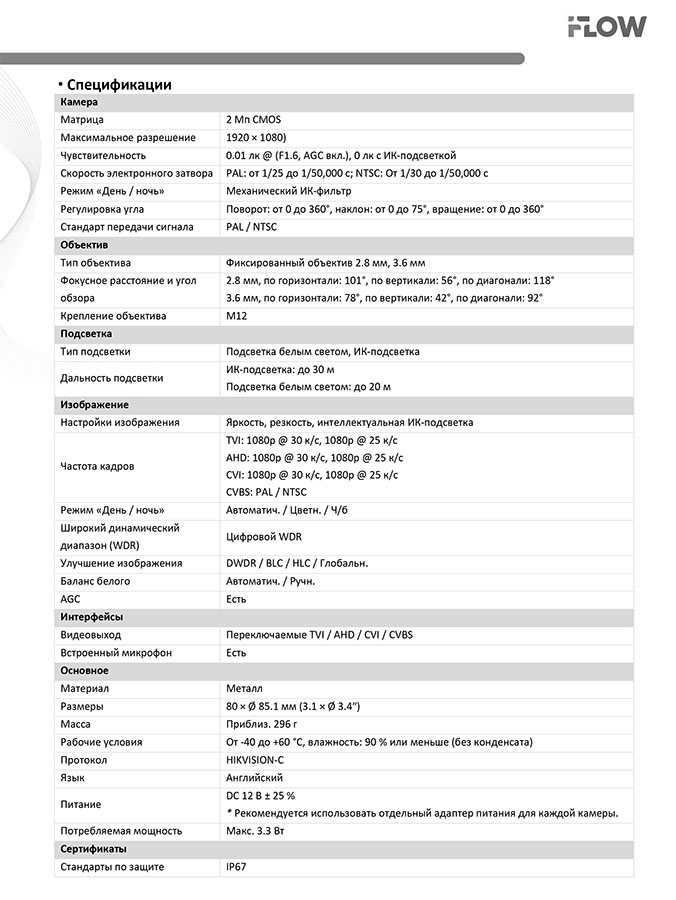 видеовыход: 1 х HD-TVI/AHD/CVI/CVBS