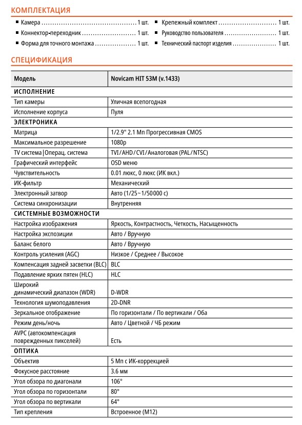 HIT 53MX (ver.1170V) уличная пуля видеокамера с микрофоном NOVIcam; TVI/AHD/CVI/CVBS; матрица 1/2.7" CMOS; 5 Мп 20 к/с; объектив фиксированный 3.6 мм; уличная всепогодная IP66; комбинированная подсветка 30м, 0.02 люкс; D-WDR; угол обзора по в/г/д: 43.7°/85.8°/96°; встроенный микрофон; -45° ~ +60°С; 70×183.6 мм.