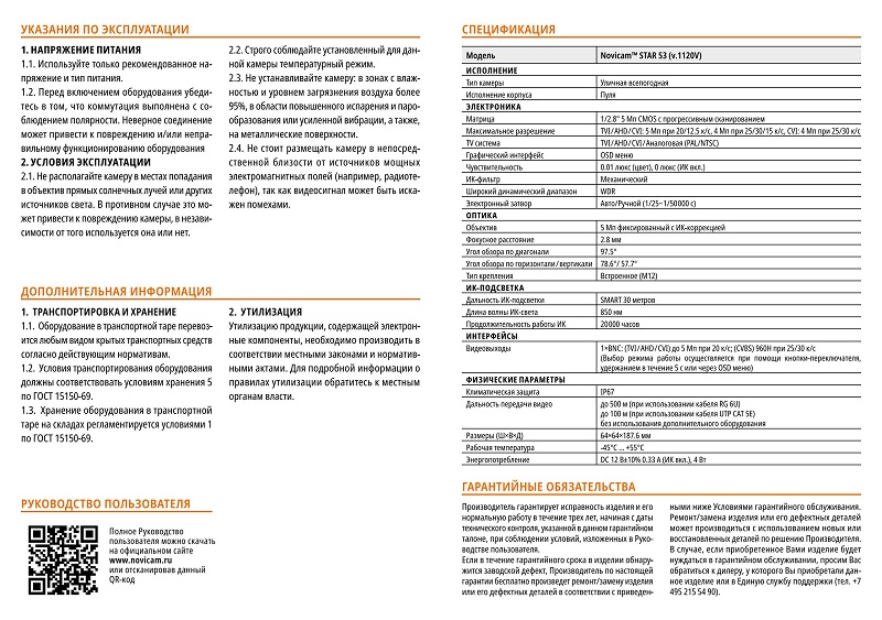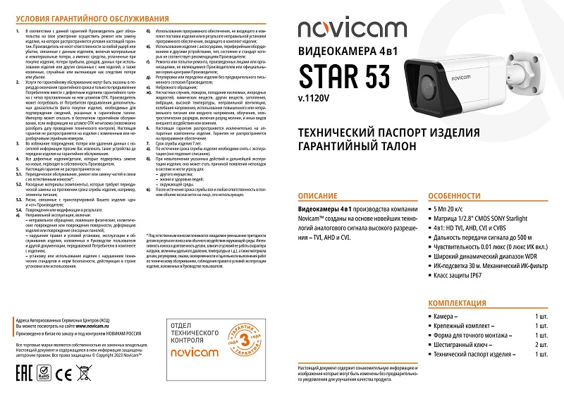 STAR 53 (ver.1120V) видеокамера уличная всепогодная Novicam; 4 в 1: TVI, AHD, CVI и аналог; 1/2.8" 5 Мп прогрессивная CMOS; объектив 2.8 мм; True WDR; ИК подсветка SMART 30 м; угол обзора по в/г/д: 57.7°/78.6°/97.5°; IP67; -30° ~ +60°С; 64х64x187.6 мм.