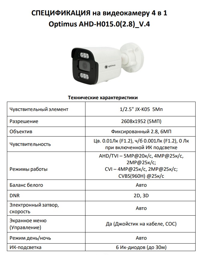 В основе камеры Optimus AHD-H015.0(2.8)_V.4 лежит чувствительный элемент производства JX-K05 диагональю 1/2.5" и разрешением 5 Мп. Камера позволяет получать качественное изображение высокого разрешения 2608х1952 пикселей. Модель оборудована фиксированным объективом 2.8 мм. Чувствительность камеры 0.01Лк (F1.2), ч/б 0.001Лк (F1.2), 0 Лк при включенной ИК подсветке.