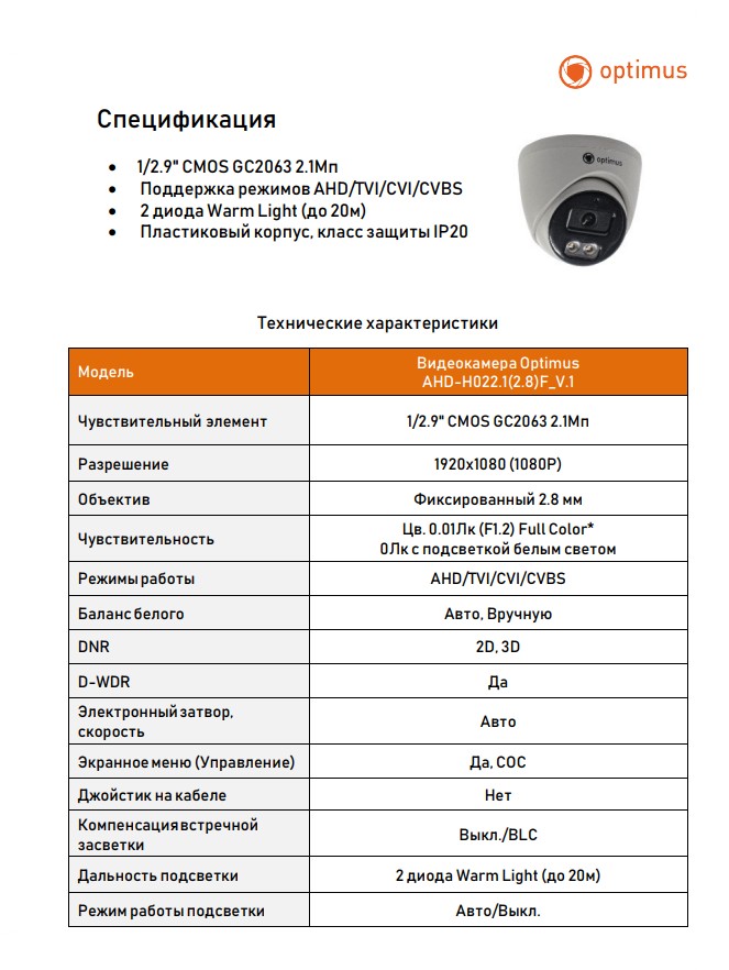 AHD-H022.1(2.8)F_V.1 видеокамера Optimus; 1/2.9" CMOS GC2063 2.1Мп; фиксированный 2.8 мм; AHD/TVI/CVI/CVBS; 2 диода Warm Light (до 20м); NTSC/PAL; 1920х1080 (1080P); DC12V±10%; DNR: 2D, 3D; потребляемая мощность 250 мА; пластик, IP20; от -10 °С до +50 °С; 90х82 мм; 150 г.