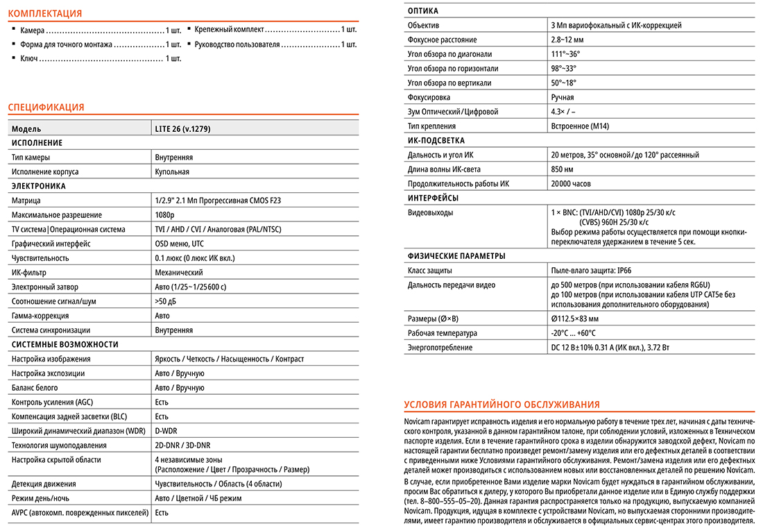 LITE 26 (ver.1279) видеокамера внутренняя купольная Novicam; 1/2.9" 2.1 Mpix прогрессивная CMOS F23; (TVI/AHD/CVI) 1080p 25/30 к/с, (TVI/AHD/CVI) 720p 25/30 к/с, (CVBS) 960H PAL/NTSC; объектив вариофокальный 2,8-12 мм; угол обзора В/Г/Д: 50°~18°/ 98°~33°/ 111°~36°; механический ИК-фильтр; ИК-подсветка 20 м; 35° основной/до 120° рассеянный; защита от переполюсовки; 3D вращение камеры в корпусе; AVPC; D-WDR; 2D-DNR / 3D-DNR; -20° ~ +60°С; 112.5x83 мм.