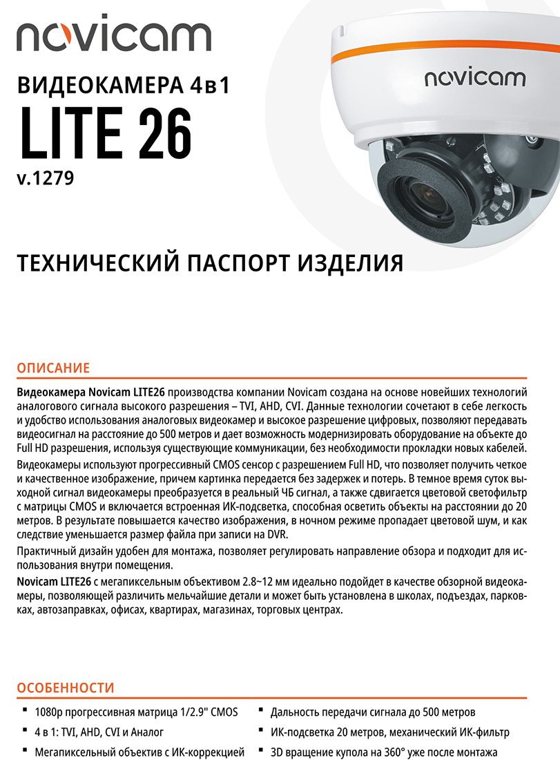 Novicam LITE 26 с мегапиксельным объективом 2.8~12мм идеально подойдет в качестве обзорной видеокамеры, позволяющей различить мельчайшие детали и может быть установлена в школах, подъездах, парковках, автозаправках, офисах, квартирах, магазинах, торговых центрах.