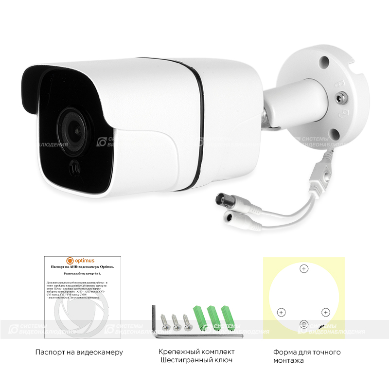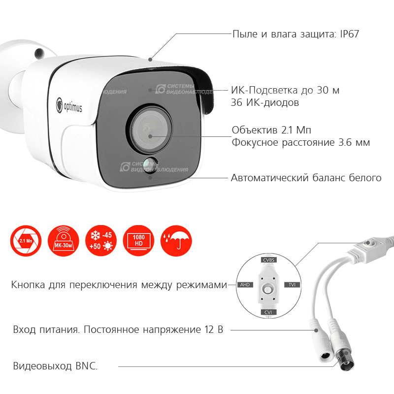 AHD-H012.1(3.6)_V.3 уличная камера видеонаблюдения Optimus; 1/2.9" 2.1Мп CMOS Sony IMX323; (1920х1080); объектив фиксированный 3.6 мм; ИК-подсветка 30 м, 36 Ик-диода; D-WDR; цв. белый; корпус антивандальный; IP67; от -45°С до +50°С; 193х62 мм; 256 г.
