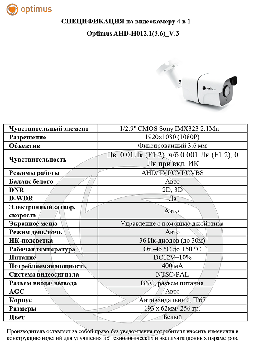 В основе камеры Optimus AHD-H012.1(3.6)_V.3 лежит чувствительный элемент CMOS Sony IMX323 диагональю 1/2.9" и разрешением 2.1 Мп. Камера позволяет получать качественное изображение высокого разрешения 1920х1080 пикселей. Модель оборудована фиксированным объективом 3.6 мм. Чувствительность камеры 0,01 Лк.