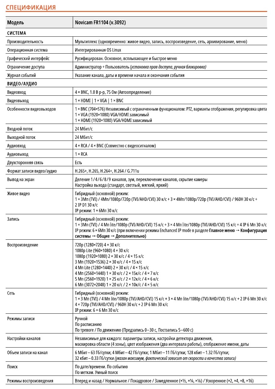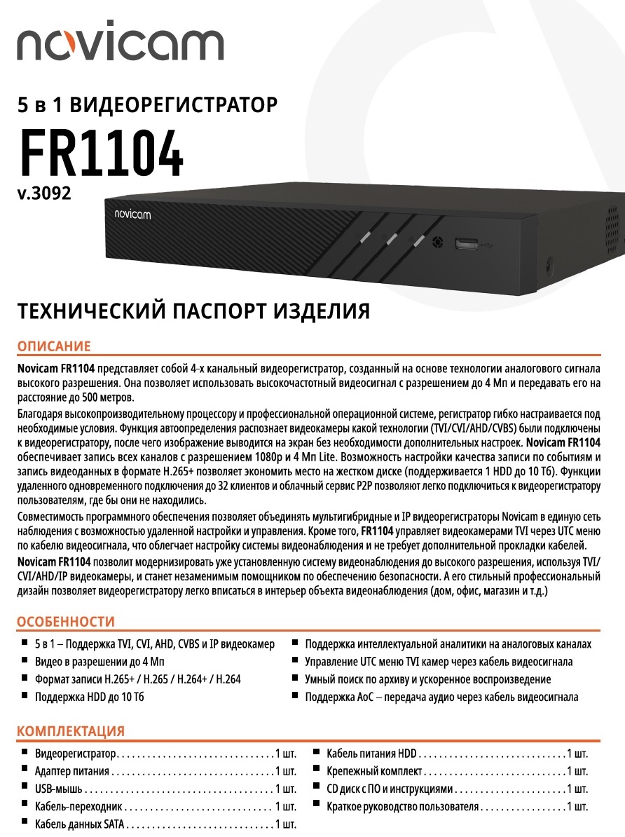 FR1104 (ver.3092) гибридный видеорегистратор 4-х канальный Novicam; гибридный (основной) режим: 1 × 3Мп (TVI) / 4 Мп lite/1080р (TVI/AHD/CVI) 15 к/с + 3 × 4 Мп lite/1080р (TVI/AHD/CVI) 15 к/с + 4 IP 6 Мп 30 к/с IP режим: 6 × 6Мп 30 к/с; 1 x SATA 3,5" до 10 Тб; бесплатный облачный сервис Р2Р; 4 × RCA; от -10°C до +55°C; 315×45×242 мм.