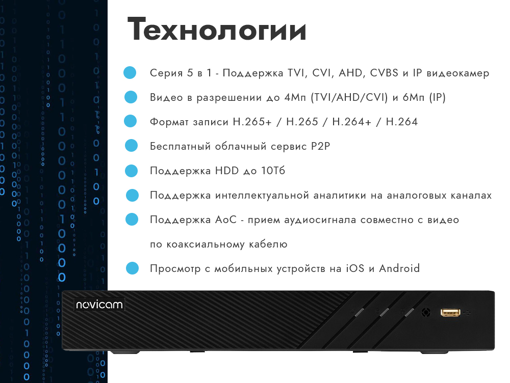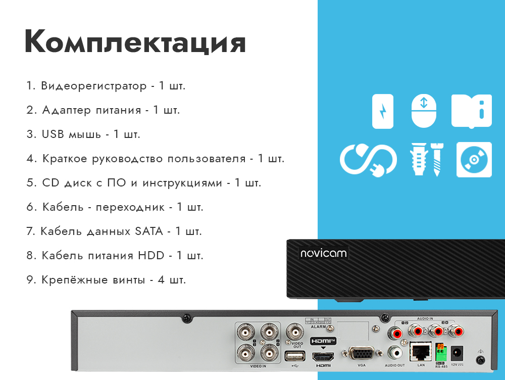 Novicam FR1104 позволит модернизировать уже установленную систему видеонаблюдения до высокого разрешения, используя TVI/CVI/AHD/IP видеокамеры, и станет незаменимым помощником по обеспечению безопасности. А его стильный профессиональный дизайн позволяет видеорегистратору легко вписаться в интерьер объекта видеонаблюдения (дом, офис, магазин и т.д.).
