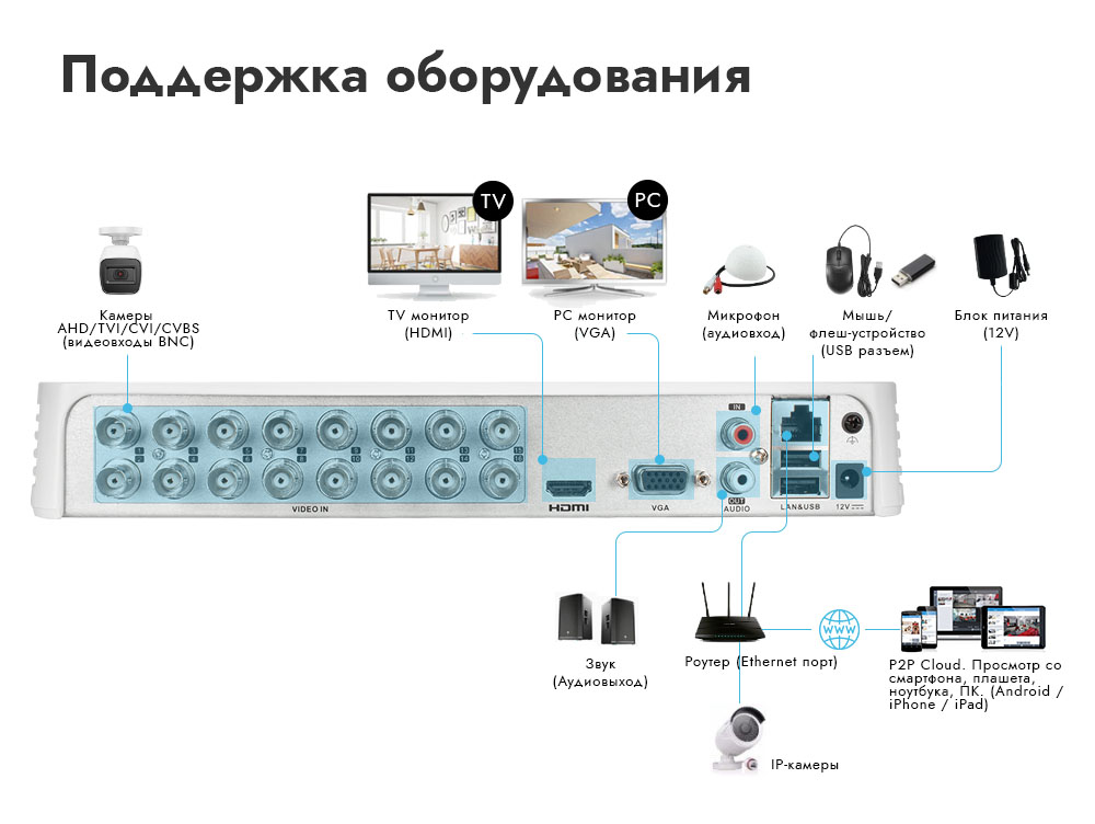Видео в разрешении до 1080p (TVI) и 5 Мп (IP)