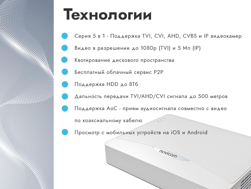 Novicam FR1016L позволит модернизировать уже установленную систему видеонаблюдения до высокого разрешения, используя TVI/CVI/AHD/IP видеокамеры, и станет незаменимым помощником по обеспечению безопасности. А его компактный стильный дизайн позволяет видеорегистратору легко вписаться в интерьер любого помещения (дом, офис, магазин и т.д.).