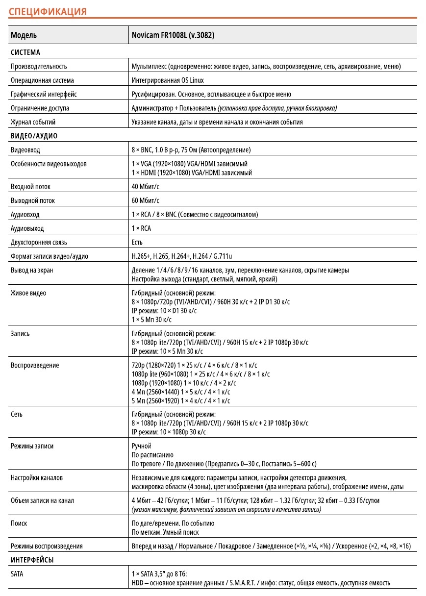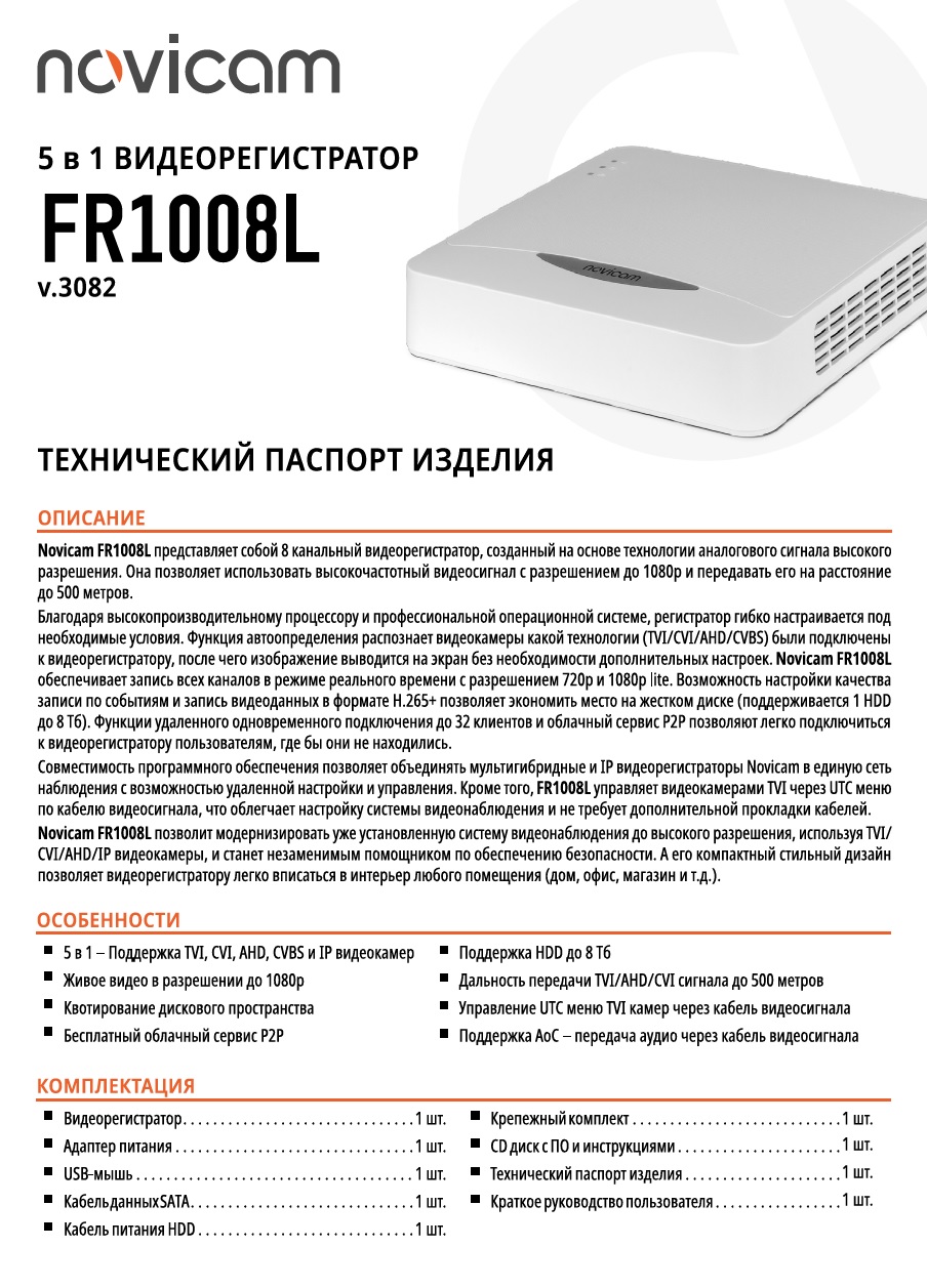 FR1008L (ver.3082) гибридный видеорегистратор 8-ми канальный Novicam; гибридный (основной) режим: 8*1080p lite/720р (TVI/AHD/CVI) / 960H 15 к/с + 2 IP 5 Мп 30 к/с; IP режим: 10*5 Мп 25/30 к/с; формат записи: H.265+, H.265, H.264+, H.264 / G.711u; поддержка TVI, CVI, AHD, CVBS и IP видеокамер; поддержка HDD: 1*SATA 3,5" до 8Тб; 2*USB 2.0; 1* RCA / 8*BNC; Р2Р; -10°C ~ +55°C; 200x48x200 мм.