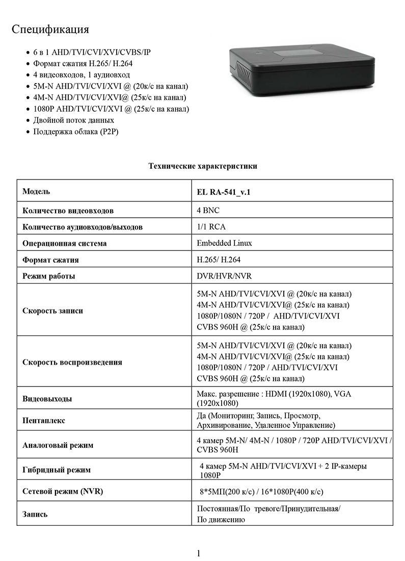 EL RA-541_V.1 цифровой гибридный видеорегистратор 4-х канальный EL; запись: 5M-N AHD/TVI/CVI/XVI @ (20к/с на канал), 4M-N AHD/TVI/CVI/XVI@ (25к/с на канал), 1080P/1080N / 720P / AHD/TVI/CVI/XVI CVBS 960Н @ (25к/с на канал); формат записи: H.265/ H.264; пентаплекс; поддержка HDD: 1 х 14 Тб (серия HDD для видеонаблюдения); USB 2* USB 2.0; Р2Р; 1 x RCA; 0°C ~ +55°C; 260x230x42 мм; 998 г.