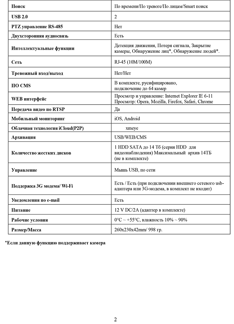 Интеллектуальные функции: Детекция движения, Потеря сигнала, Закрытие камеры, Обнаружение лиц*, Обнаружение людей*.