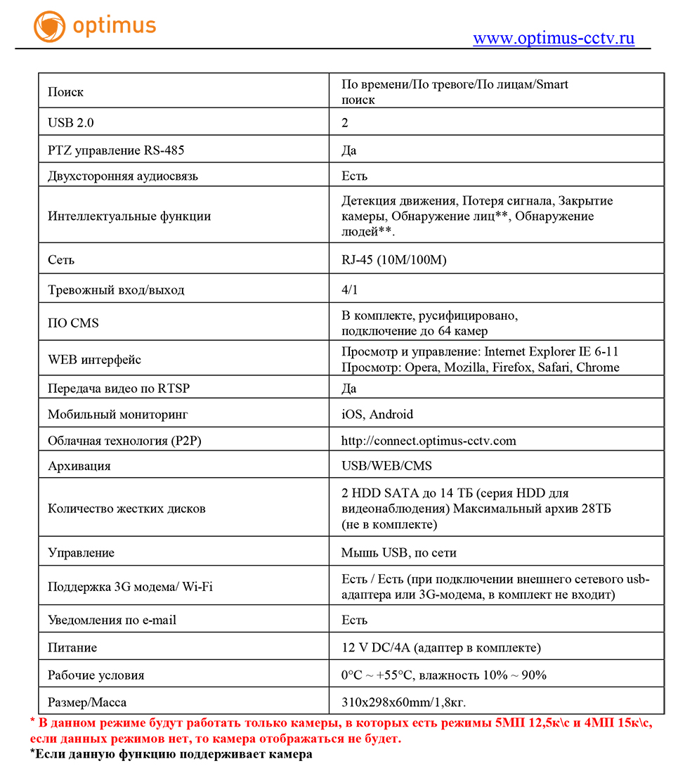 Поддерживает режим работы пентаплекс: мониторинг, запись, просмотр, архивирование, удаленное управление. Резервное копирование может производиться через USB, WEB, CMS.