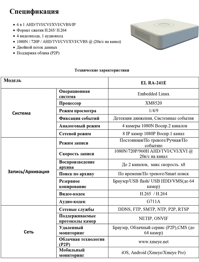 EL RA-241E цифровой гибридный видеорегистратор 4-х канальный EL; 6 в 1 AHD/TVI/CVI/XVI/CVBS/IP; 1080N/720P/960H AHD/TVI/CVI/XVI @ 20к/с на канал; NETIP, ONVIF; 1/1 RCA; H.265/H.264; 1 HDD SATA до 14 ТБ; 12В (2А); 0°С...+55°С; 210х198х47 мм; 750 г.