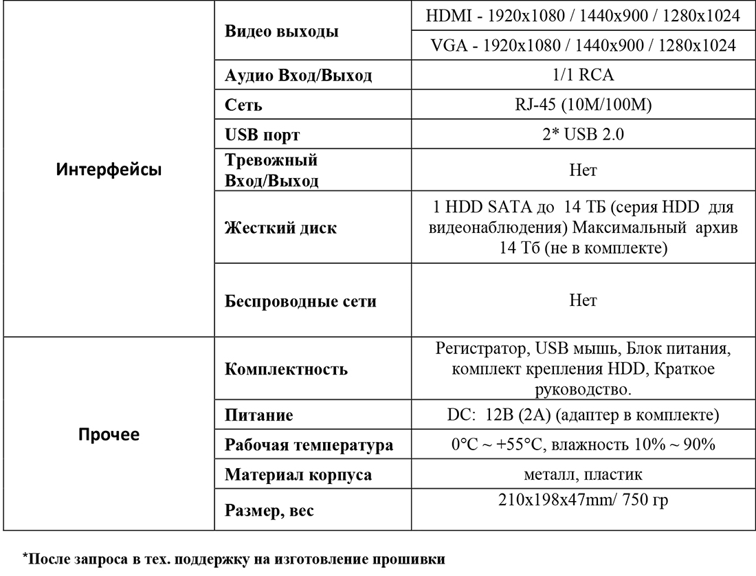 Количество жестких дисков: 1 HDD SATA до 14 ТБ (серия HDD для видеонаблюдения) Максимальный архив 14TБ (не в комплекте)