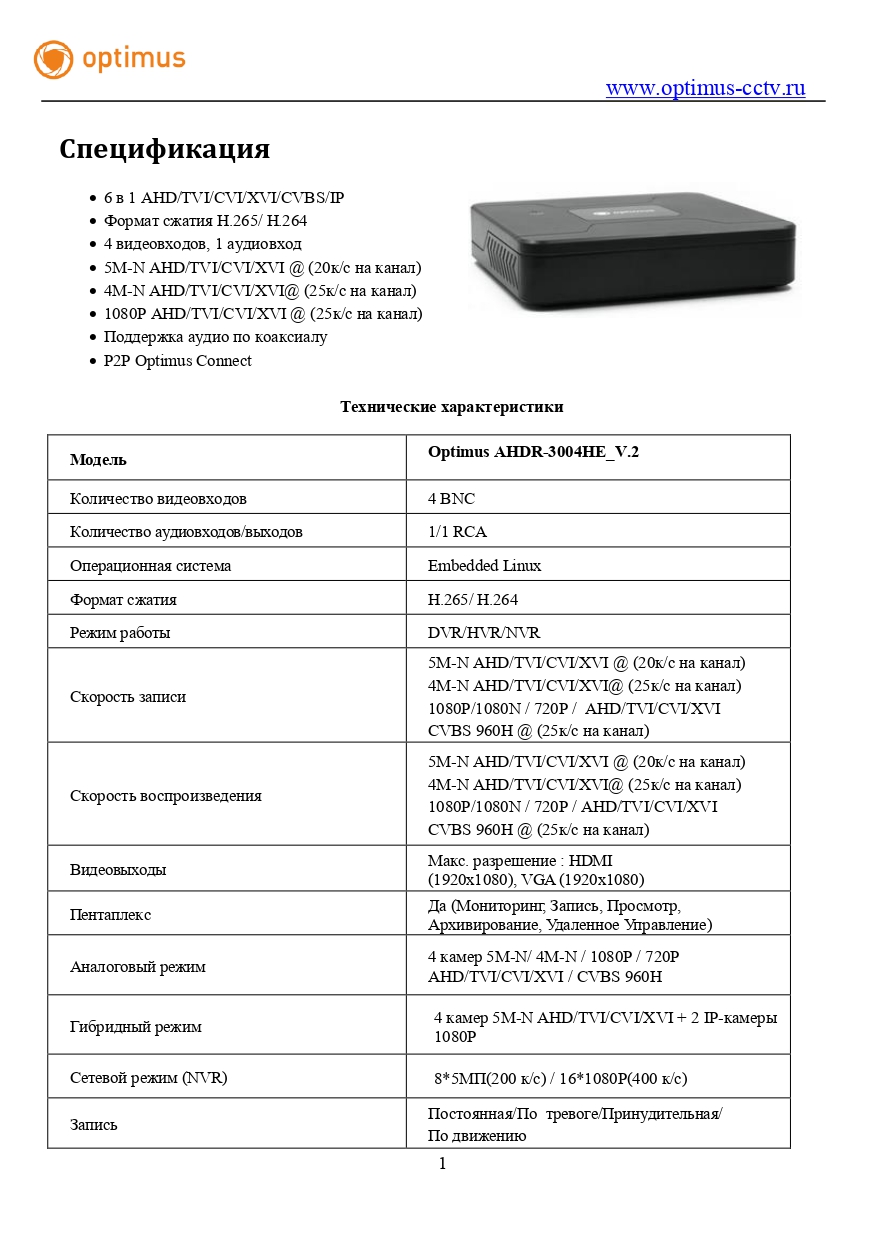 AHDR-3004HE_V.2 цифровой гибридный видеорегистратор 4-х канальный Optimus; запись: 5M-N AHD/TVI/CVI/XVI @ (20к/с на канал) 4M-N AHD/TVI/CVI/XVI@ (25к/с на канал) 1080P/1080N / 720P / AHD/TVI/CVI/XVI CVBS 960Н @ (25к/с на канал); H.265/ H.264; 1 RCA; 1 HDD SATA до 14 Тб; 2* USB 2.0; поддержка 3G модема/ Wi-Fi; 0°С...+55°С; 210х210х50мм; 450 г.