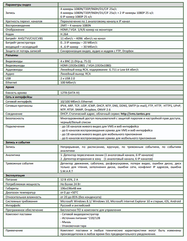 TSr-UV0418 Eco (версия 2021г) - Мультиформатный AHD/TVI/CVI 4-х канальный H.265+ / H.264+ видеорегистратор + 2 дополнительных канала IP (1080Р). Запись: 4 камеры 1080N (960х1080)/ 720P (1280х720) 25к/с или 4 камеры 1080N (960х1080)/ 720P (1280х720) 15к/с + 2 IP камеры 1080P 25 к/с или 6 IP камер 1080P 25 к/с. Поддержка облачного сервиса vms2.tantos.pro (IE, iPhone, Android). Одновременный просмотр, запись и работа с архивом. HDD до 8Тб. 2 порта USB 2.0, 100Mb Ethernet, HDMI (1920×1080) /VGA (1920×1080, 1 вход / 1 выход звука RCA, 4 канала аудио по коаксиалу (AoC) – только для TVI камер. БП, мышь в комплекте. Синхронизация с FTP, Dropbox. Запись непрерывная, по расписанию, вручную, по тревожным событиям, по событиям видеоаналитики. Подключение сторонних IP камер по ONVIF и RTSP.