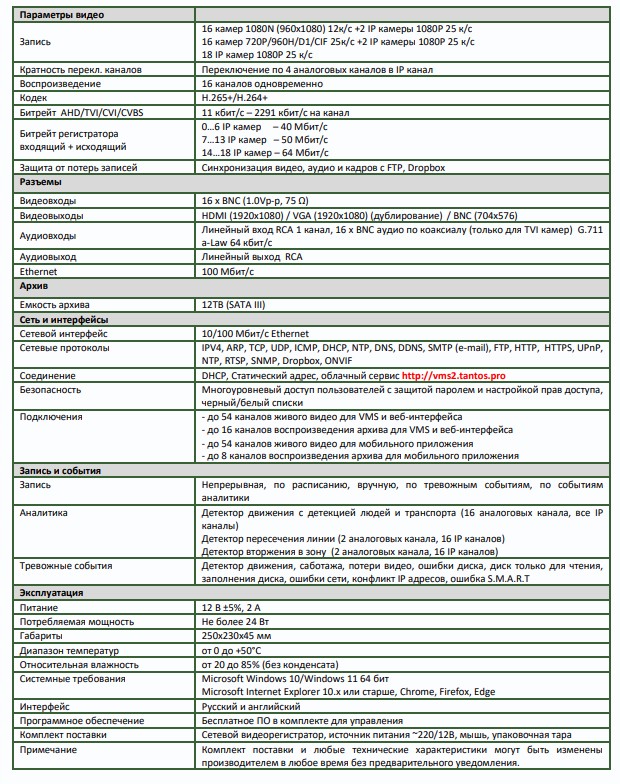 TSr-UV1616 - Мультиформатный AHD/TVI/CVI/CVBS 16-ти канальный H.265+/H.264+ видеорегистратор + 2 дополнительных канала IP 2 МП. Запись: 16 камер 1080N AHD/TVI/CVI 12 к/с + 2 дополнительных канала IP (1080Р) 25к/с; 18 IP камер 1080P 25к/с; 16 камер 960H/D1/CIF 25к/c+ 2 дополнительных канала IP (1080Р) 25к/с. Поддержка облачного сервиса vms2.tantos.pro (iPhone, iPad, Android). Одновременный просмотр, запись и работа с архивом. 1 SATAHDD до 12Тб. 2 порта USB 2.0, 100Mb Ethernet, HDMI (1920×1080) /VGA (1920×1080) / BNC (704x576), 1 вход / 1 выход звука RCA, 16 каналов аудио по коаксиалу (AoC) – только для TVI камер. БП, мышь в комплекте. Запись непрерывная, по расписанию, вручную, по тревожным событиям, по событиям видеоаналитики. Детектор людей и транспорта для всех каналов. Подключение сторонних IP камер по ONVIF и RTSP.