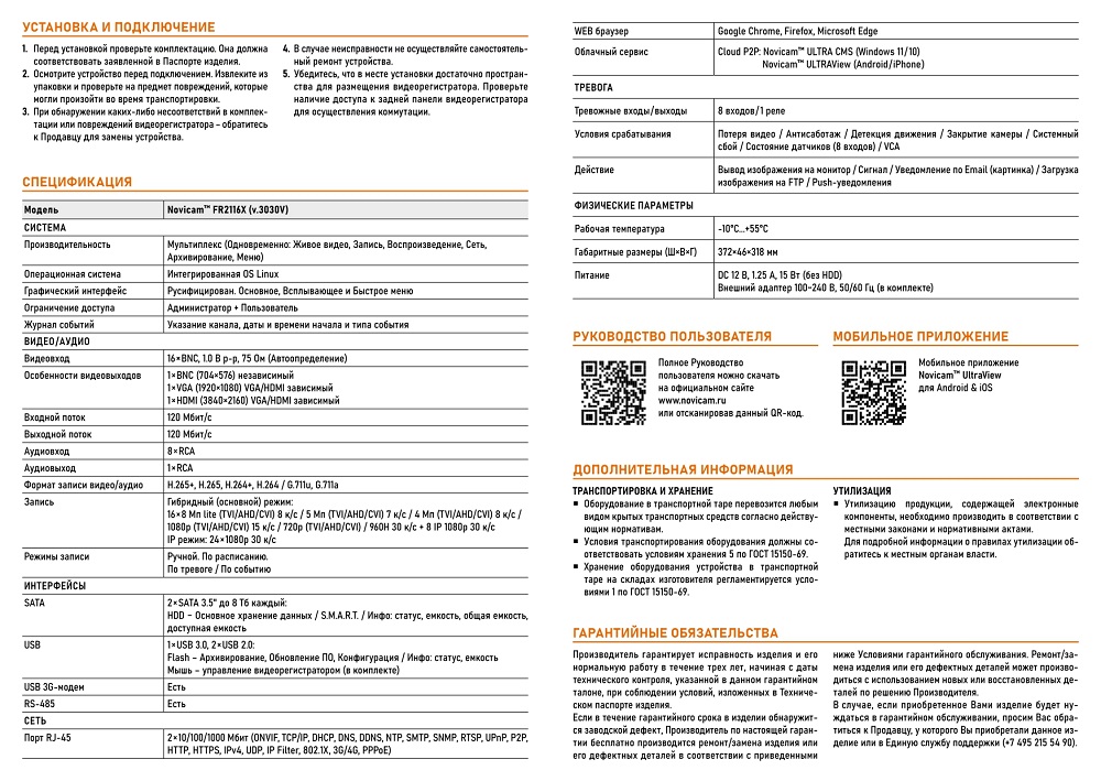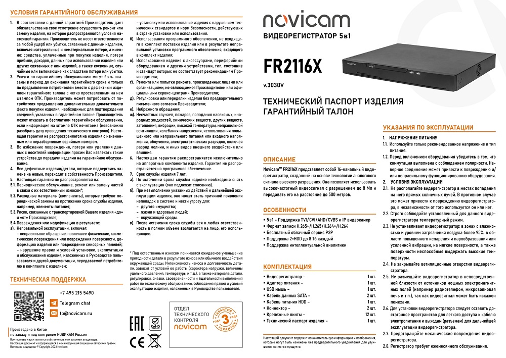 FR2116X (ver.3030V) 16-ти канальный видеорегистратор 5 в 1 и IP до 2 Мп Novicam; гибридный (основной) режим: 16 x 8Мп lite (TVI/AHD/CVI) 8к/с / 5Мп (TVI/AHD/CVI) 7к/с / 4Мп (TVI/AHD/CVI) 8к/с / 1080р (TVI/AHD/CVI) 15 к/с / 720р (TVI/AHD/CVI) / 960H 30 к/с + 8 IP 1080p 30 к/с, IP режим: 24 х 1080p 30 к/с; H.265+, H.265, H.264+, H.264 / G.711u, G.711a; 8 × RCA; 2 × SATA 3,5" до 8Тб каждый; от -10°C до +55°C; 372×46×318 мм.