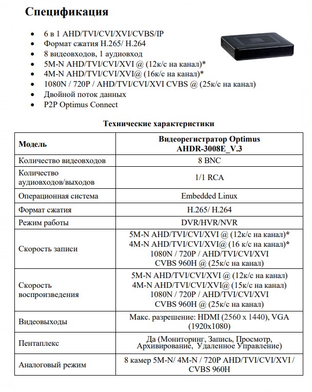 AHDR-3008E_V.3 цифровой гибридный видеорегистратор 8-ми канальный Optimus; Embedded Linux; 5M-N AHD/TVI/CVI/XVI @ (12к/с на канал); 4M-N AHD/TVI/CVI/XVI@ (15к/с на канал) 1080N/720P; AHD/TVI/CVI/XVI CVBS 960Н @ (25к/с на канал); поддержка 3G модема/Wi-Fi; 1 HDD SATA до 14 Тб (серия HDD для видеонаблюдения) максимальный архив 14TБ (не в комплекте); 8 BNC; 1/1 RCA; 0°С ~ +55°С; 235x210x45 мм; 510 г.