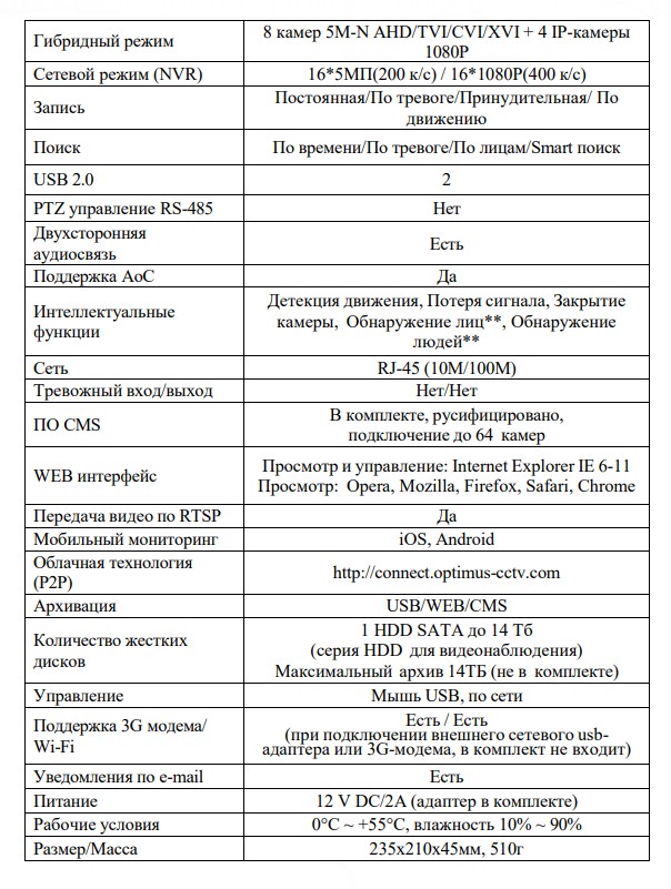 Аналоговый режим: 8 камер 5M-N/4M-N/720P AHD/TVI/CVI/XVI/CVBS 960Н
