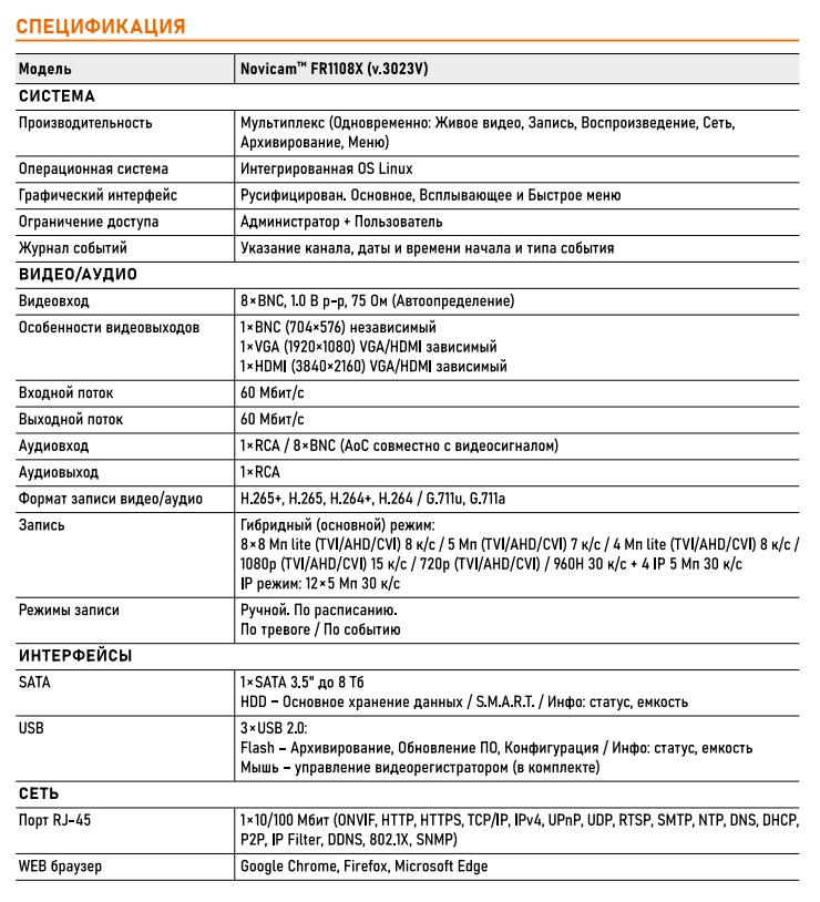 FR1108X (ver.3023V) 8-ми канальный видеорегистратор 5 в 1 и IP до 5 Мп Novicam; TVI, CVI, AHD, CVBS и IP; H.265+, H.265, H.264+, H.264 / G.711u, G.711a; 1xSATA 3,5" до 8Тб; от -10°C до +55°C; 255x45x225 мм; 0,5 кг.
