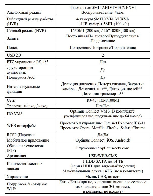 Интеллектуальные функции: Детекция движения, Потеря сигнала, Закрытие камеры, Детекция лиц**, Детекция людей**, Детекция транспорта**