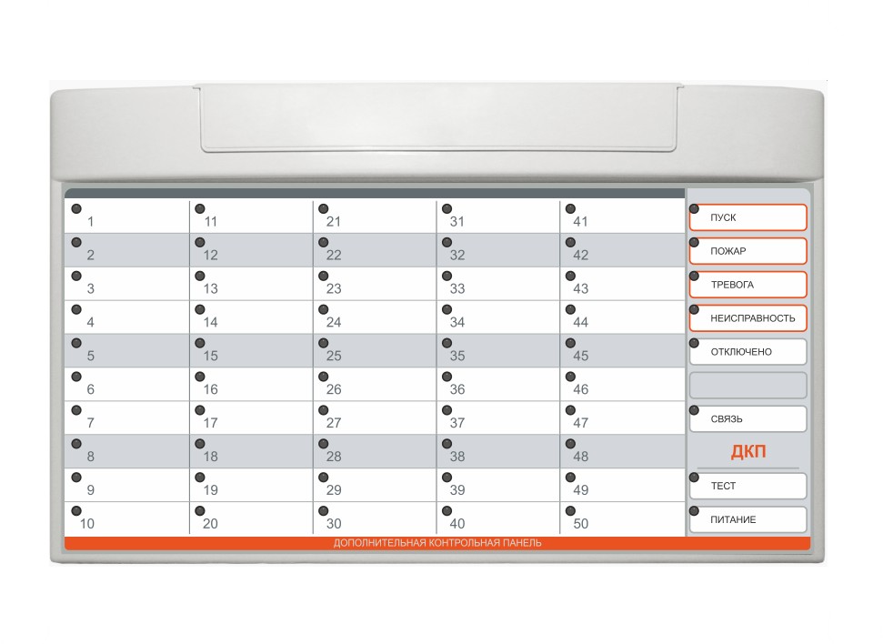 ДКП обеспечивает дублирование световой индикации КП: индикаторов адресных зон прибора, обобщённых индикаторов прибора: «ПУСК», «ПОЖАР», «ТРЕВОГА», «НЕИСПРАВНОСТЬ», «ОТКЛЮ-ЧЕНО», «СВЯЗЬ», «ТЕСТ», «ПИТАНИЕ».