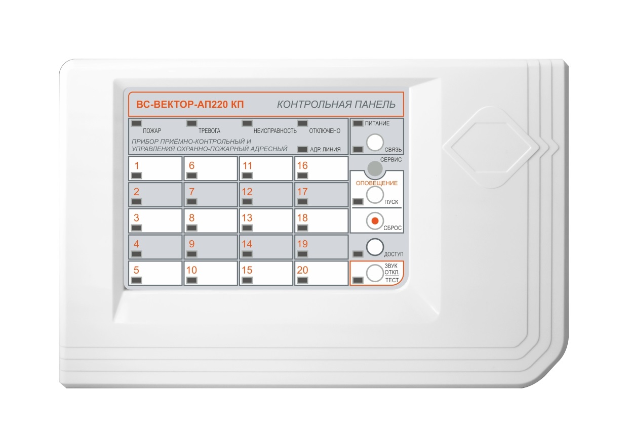 Основу прибора «ВС-ВЕКТОР-АП220» составляет адресная контрольная панель «ВС-ВЕКТОР-АП220 КП» (далее – контрольная панель, панель, или КП). Совместно с контрольной панелью может быть использовано устройство регистрации событий «ВС-УРС ВЕКТОР» (далее – УРС). Взаимодействие КП с УРС обеспечивается с помощью двухстороннего обмена данными по адресной линии связи RS-485. Взаимодействие прибора с адресными извещателями, оповещателями и тревожными кнопками обеспечивается с помощью двухстороннего обмена данными по проводной адресной линии (АЛ).