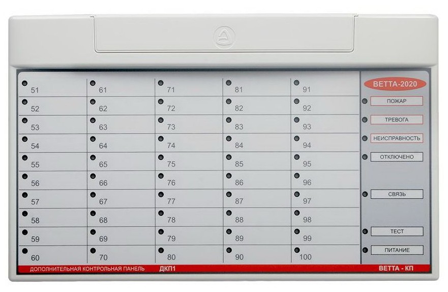 Дополнительная контрольная панель. Обеспечивает контроль до 50-и адресных зон объектовых приборов под управлением панели «ВЕТТА-ОКП». В зависимости от литеры отображают состояние адресных зон с диапазонами адресов 51…100. Питание от внешнего ИП 12 В.
