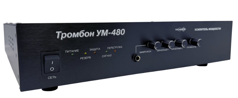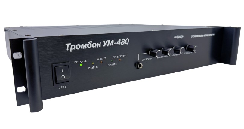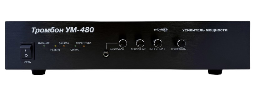 Усилитель мощности «Тромбон УМ-480» предназначен для использования в составе систем оповещения людей о пожаре в зданиях и сооружениях. Усилитель может применяться в системах звукового вещания и радиотрансляции. Номинальная выходная мощность 480 Вт, диапазон воспроизводимых частот 100-20000Гц, выходное напряжение 30, 70, 100, 120 В, 1 микрофонный вход, 2 линейных входа, 1 вход оповещения, 1 выход оповещения, основное питание 220В(AC) / резервное питание 24В(DC), потребляемая мощность от сети переменного тока 630 Вт, высота корпуса 2U 19" для установки в стойку или настольного исполнения, габариты 438*285*88 мм, вес 13.0 кг. Усилитель имеет встроенную защиту от перегрузки. В качестве источников резервного питания рекомендуется блок резервного питания Тромбон БП-21. В усилителе предусмотрена возможность резервирования, в случае отказа работающего усилителя, либо отказа источника питания, питающего усилитель.