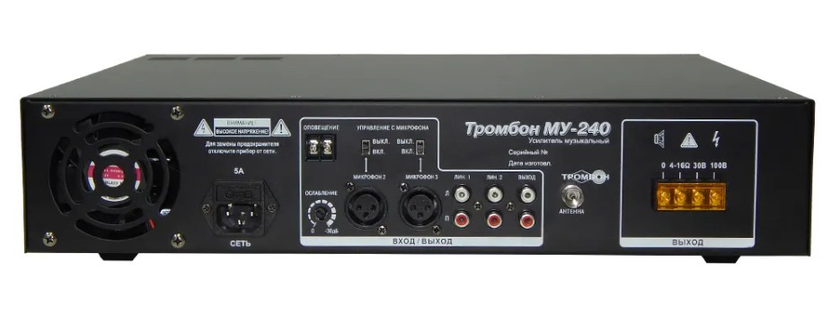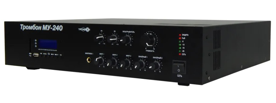 Усилитель музыкальный «Тромбон МУ-240» с номинальной выходной мощностью 240 Вт, предназначен для построения систем звукового вещания и музыкальной трансляции различных зданий.