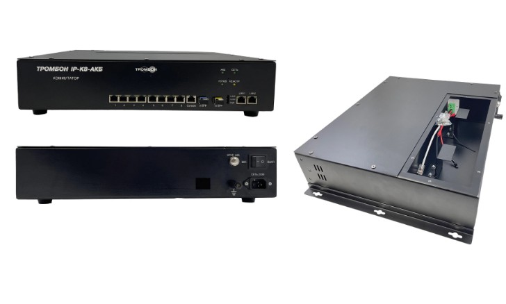 IP-К8-АКБ коммутатор Тромбон; 8 портов POE; IP40; АКБ 7Ач-9Ач, 12В; 150 Вт; +5...+40°C; 440х370х88 мм; 11 кг.