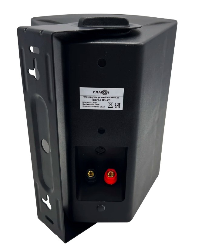 Глагол Н3-20 (чёрный) оповещатель речевой настенный Тромбон; IP40; пластик; мощность 20 Вт; номин.напряжение 100 В; звуковое давление 98 dB; настенный; 2 динамика; диапазон частот 60-20000 Гц; 0...+40°C; 220x175x150 мм; 3 кг.