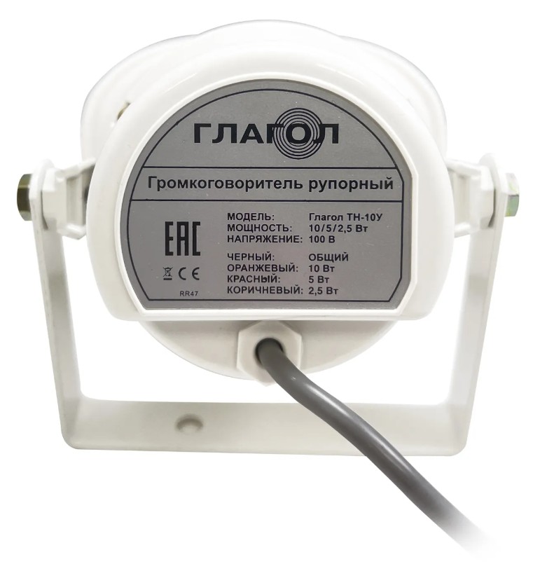 Глагол ТН-10У оповещатель уличный рупорный Тромбон; IP65; номин. вых. мощность 2,5/5/10 Вт; номин. напряжение 100 В; звук. давление 100 dB; диапазон частот 500-8000Гц; 178х128х179 мм; 1,1 кг.