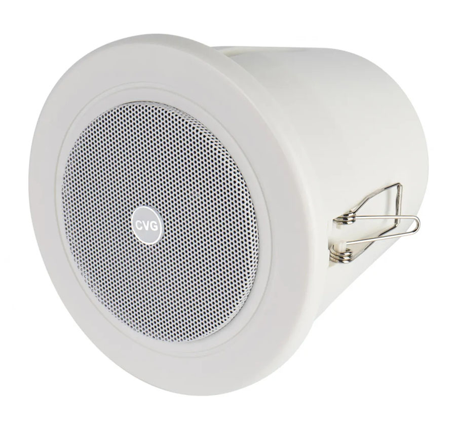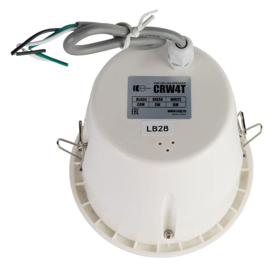 CVGaudio CRW4T - широкополосный встраиваемый в потолок влагозащищенный громкоговоритель, для систем воспроизведения фоновой музыки и речевых сообщений. Данная модель рекомендуется к установке в помещениях с большой влажностью - бассейнах, аквапарках, душевых, открытых верандах и так далее. Герметичный корпус данной модели выполнен из прочного и стойкого к воздействию влаги и высокой / низкой температуры ABS пластика, решетка защищающая диффузор изготовлена из алюминия окрашенного в цвет корпуса и также не подвержена коррозии. Уровень защиты корпуса — IP65. Данная модель предназначена только для работы в составе 100V трансляционных линий и имеет установленный внутри корпуса согласующий трансформатор, который позволяет подключить ее на две разных мощности - 3W или 6W в режиме 100V.