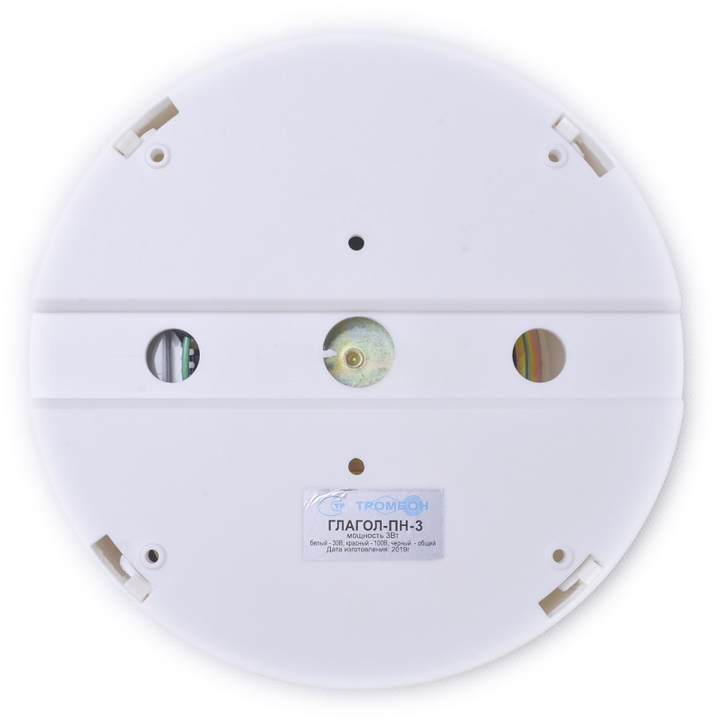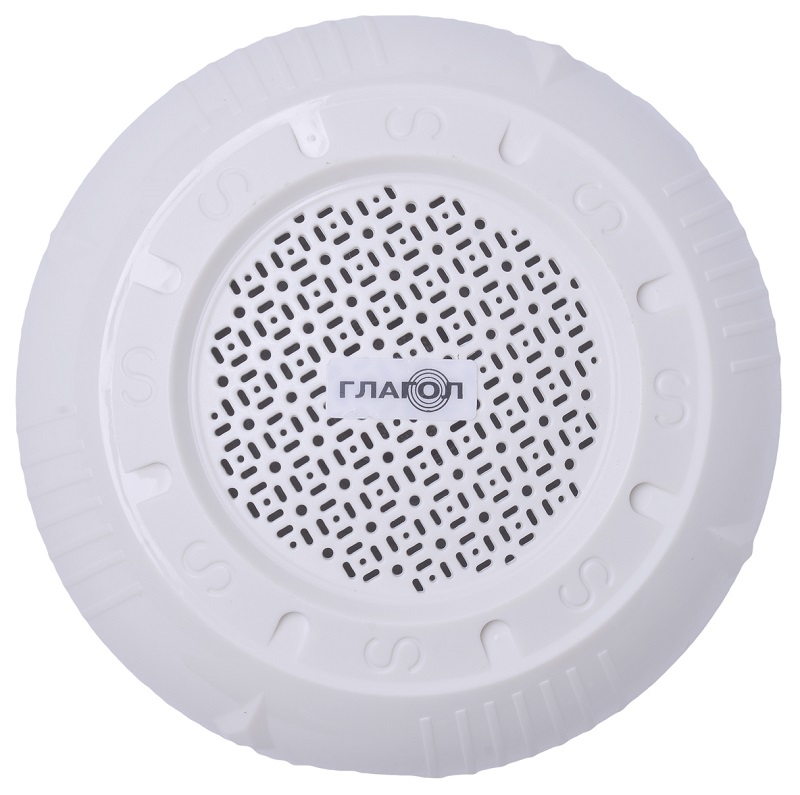Оповещатель потолочный или настенный. Крепление: кронштейн (без динамика) монтируется к поверхности стены (потолка), затем декоративная полусфера c динамиком сочленяется с кронштейном. Выходная мощность «Глагол – ПН-3» – 3 Вт. Исполнение – пластик. Напряжение линии связи – 30 и 100В.