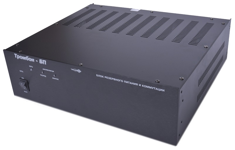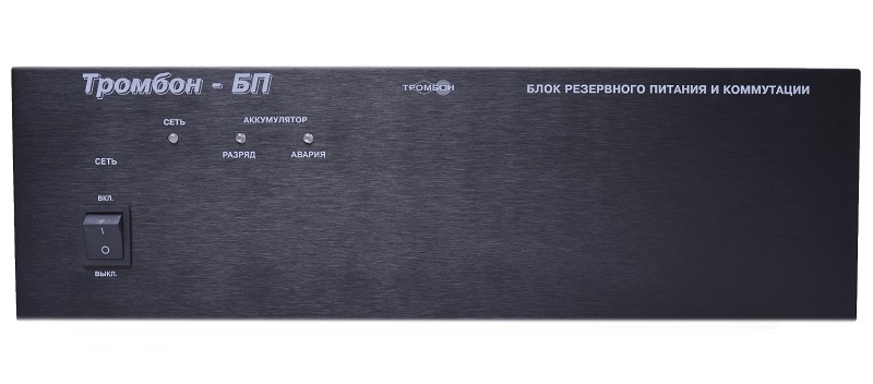 Тромбон БП-21 блок резервного питания; встроенные АКБ 21 Ач (6х7 Ач); напряжение питания 220 В; выходное напряжение на некоммутируемых выходах 24...28 В до 2 А, 12, 2...12,6 В до 2 А; выходное напряжение на коммутируемом выходе 24...28 В до 21 А; реле коммутации основного и резервного питания; контроль заряда АКБ с индикацией состояния; 438х433х132 мм / 3U; 24 кг.