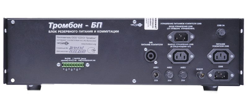 Блоки резервного питания и коммутации «Тромбон БП-14» предназначен для обеспечения резервным низковольтным электропитанием (коммутируемое 24-28В/14А, постоянное 24-28В/2А и постоянное 12В/2А) усилителей мощности и других технических средств, входящих в состав системы оповещения и управления эвакуацией. Блоки также могут быть использованы для питания системы эвакуационного освещения и управления дополнительными техническими средствами, такими как световые эвакуационные знаки безопасности, электромагнитные замки дверей эвакуационных выходов, звуковые излучатели, генераторы сирены и т.д. Поставляется с установленными АКБ 7А/ч 12В х 4шт. Может служить резервным источником питания для усилителей Тромбон УМ-120/ Тромбон УМ-240.