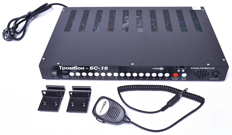 Блок-селектор Тромбон БС-16 устанавливается на посту диспетчерской и предназначен для организации двухсторонней речевой связи с вызывными панелями Тромбон-ВП, расположенными в зонах пожарного оповещения. К блоку-селектора возможно подключить до 16 линий связи с зонами оповещения, к каждой линии связи возможно подключить до 2-х вызывных панелей Тромбон ВП. Для подключения Тромбон ВП к Тромбон БС-16 используется кабель 2х2х0.2.
