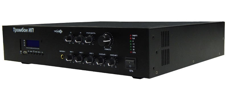 Тромбон ИП информационная приставка; микшер на 5 входов (3 микрофонных и 2 линейных); USB-вход; питания 220 В; мощьность 30 Вт; 438х370х88 мм / 2U; 10 кг.