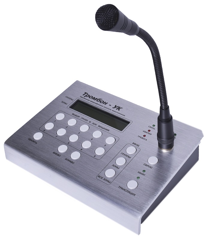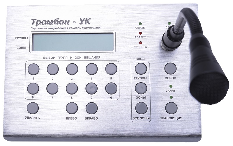Тромбон УК удаленная микрофонная консоль, количество коммутируемых зон вещания - 32; микрофонный вход, встроенный микрофон; максимальное удаление до 1200 м, -5°C ~ +70°C, IP54, 200х145х45 мм, 0,9 кг.