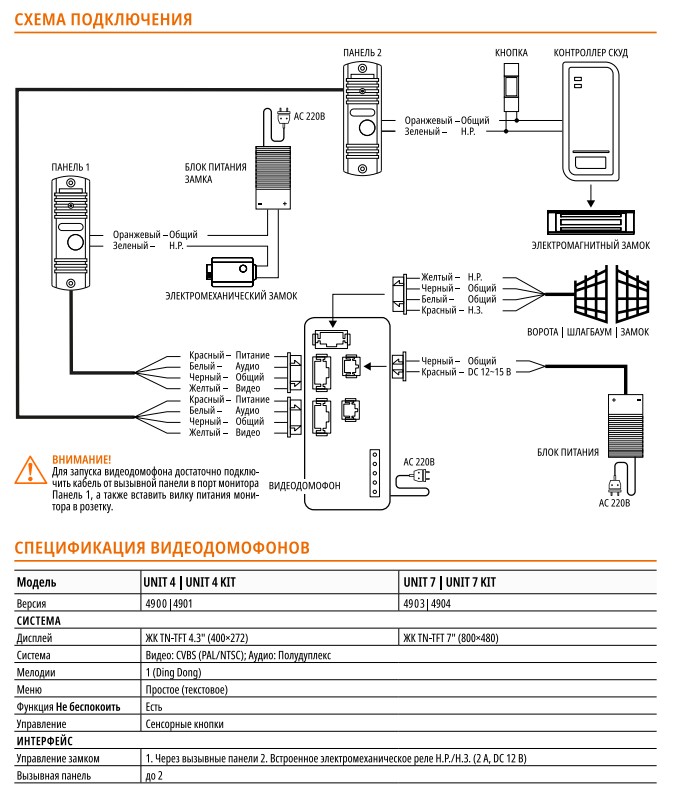 UNIT 4 KIT (ver.4901) комплект видеодомофона 4,3'' c вызывной панелью Novicam; ЖК TN-TFT; 4.3”; ИК-подсветка до 3м; угол обзора по Д/Г:95°/82°; механические кнопки; IP66; монитор - пластик, акрил; вызывная панель - алюминий; монитор -10°~ +50° С; панель -45°~ +60° С; монитор - 113х124х19 мм; вызывная панель - 42x122x23 мм.