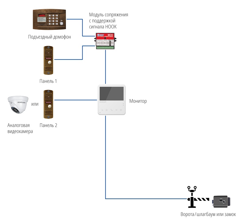 Совместим с подъездным домофоном через модуль сопряжения c поддержкой сигнала HOOK