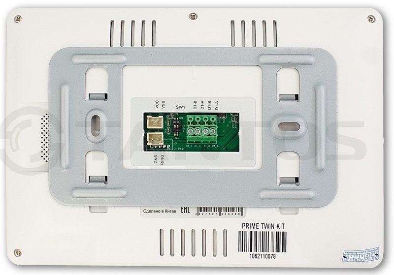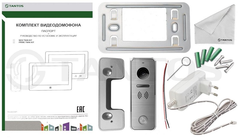 PRIME TWIN KIT комплект 2-х проводного видеодомофона Tantos; монитор: 7 дюймов / 800 х 480 пикселей; сенсорные кнопки; 2 панели; панель: угол обзора 110 град. по горизонтали / 50 град. по вертикали; инфракрасная подсветка, 0,5 метра; IP66; IK07; -25 ~ 60 C; 137x49x20 мм; блок питания: 24В пост. ток / 1А; -10 ~ 40 C; 185х127х17 мм.