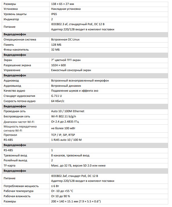 F-VI-5443I комплект IP видеодомофона с Wi-Fi iFlow; вызывная панель F-VI-1401IPMCWE1 × 1, видеодомофон F-VI-3442IPWE1 × 1; Вызывная панель: флеш-накопитель 32 МБ; оперативная память 256 МБ; 2 Мп HD-камера; ИК-подсветка 3 м; Wi-Fi 802.11 b/g/n; RS-485; IP65; -40...+53 °C; 138×65×27 мм; Видеодомофон: встроенная ОС Linux; память 128 МБ; флеш-накопитель 32 МБ; 7″ цветной TFT-экран; 1024 × 600; 802.11 b/g/n; TCP / IP, SIP, RTSP; RJ45 auto 10 / 100 M; RS-485; -10...+55 °C; 200×140×15.1 мм.