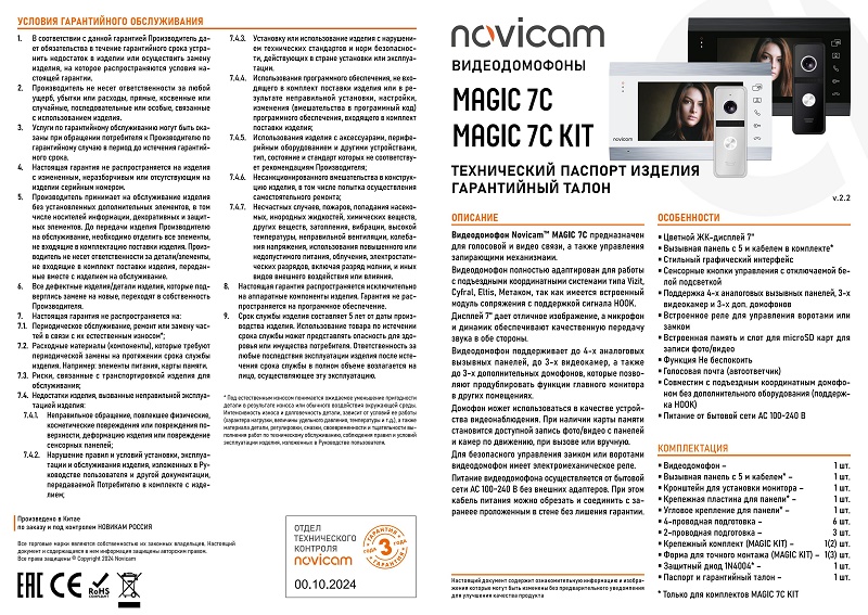 MAGIC 7C KIT WHITE (ver.4221) комплект из видеодомофона с 7" дисплеем и вызывной панели Novicam; цветной ЖК TN-TFT; 800x480; фокусное расстояние 1.9мм; управление: домофон сенсорные кнопки, панель механическая кнопка; угол обзора по д/г:127°/120°; microSD до 32Гб; IP66; цвет: домофон белый, панель серебро; домофон 238х144х19 мм, панель 48x132x19 мм.