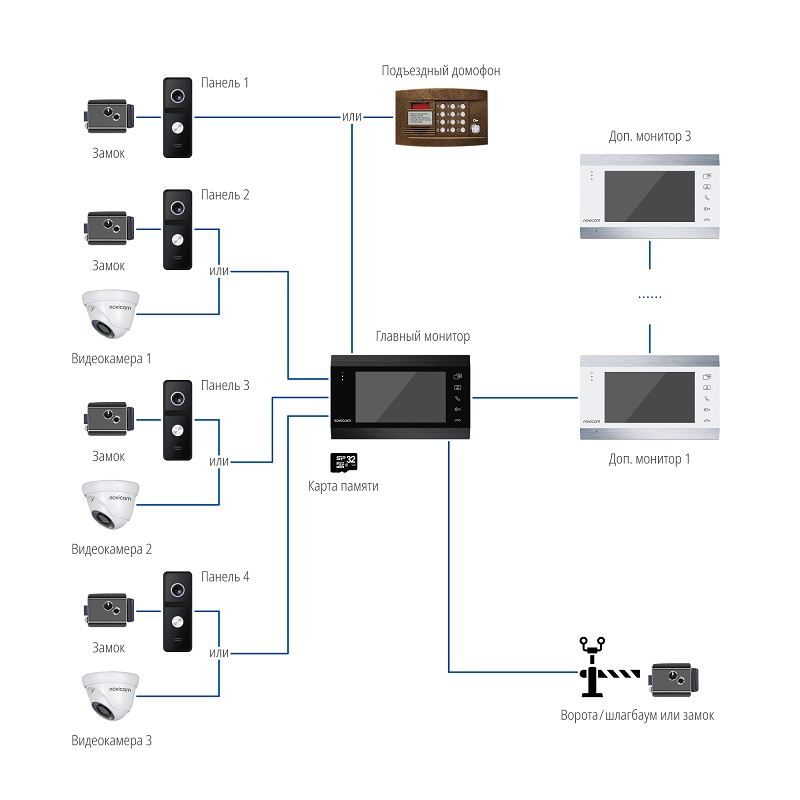 Поддержка 4 аналоговых вызывных панелей, 3 видеокамер и 3 доп.домофонов